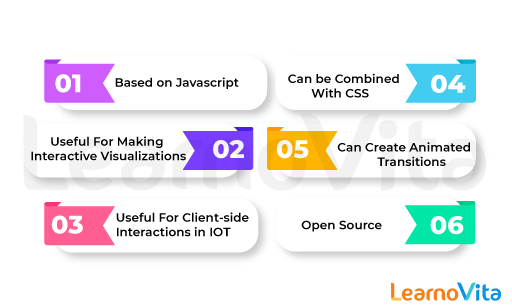 - Another powerful feature of a D3.js is the use of animations. D3.js makes a documents powerful by allowing updates on a client side and actively using a data conversion to reflect visual effects in browser.